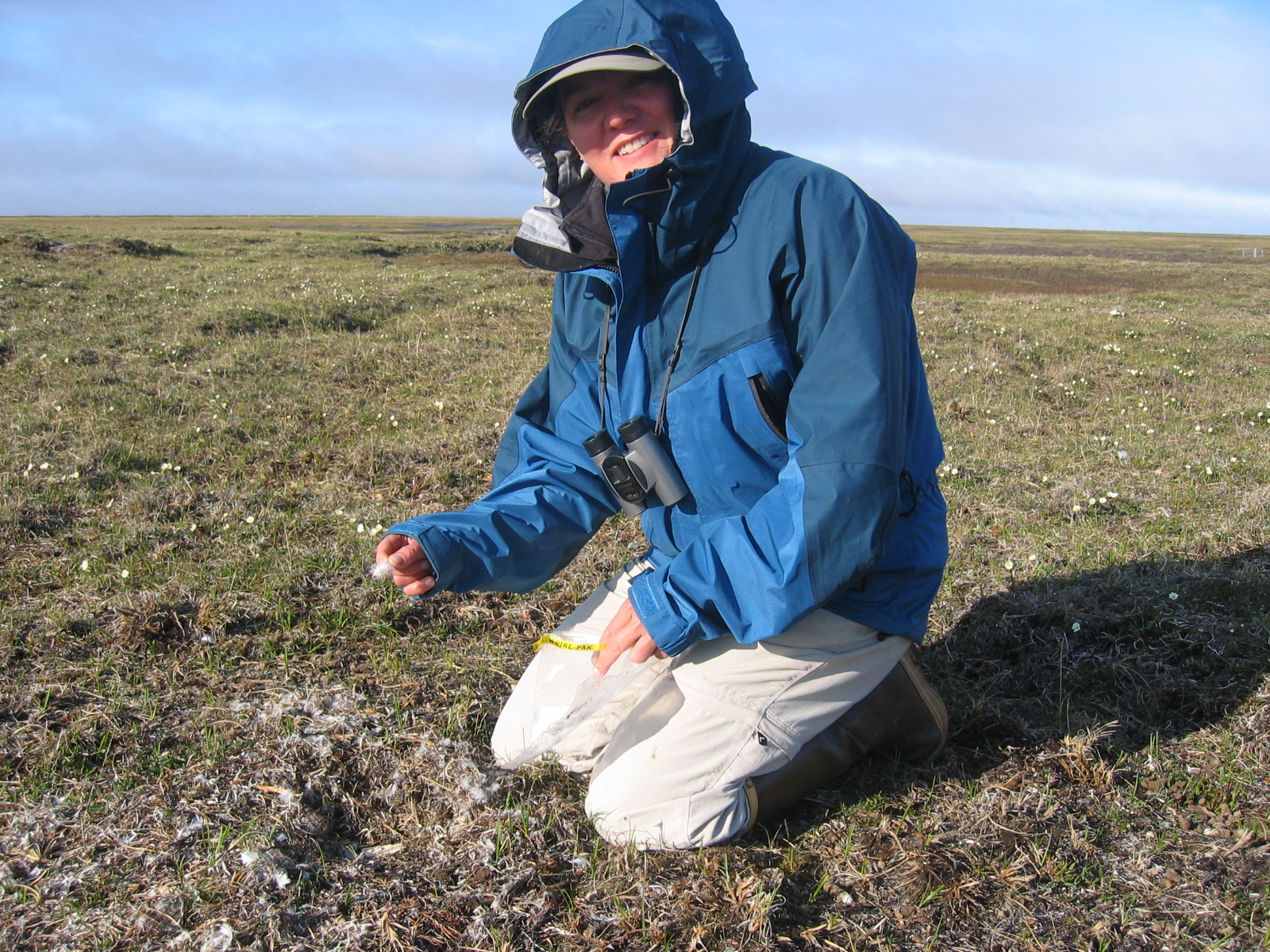 TREC teacher Leslie Pierce picks pin feathers that will be used in a genetic study of the snow geese (*Chen caerulescens*) of the Ikpikpuk Delta.