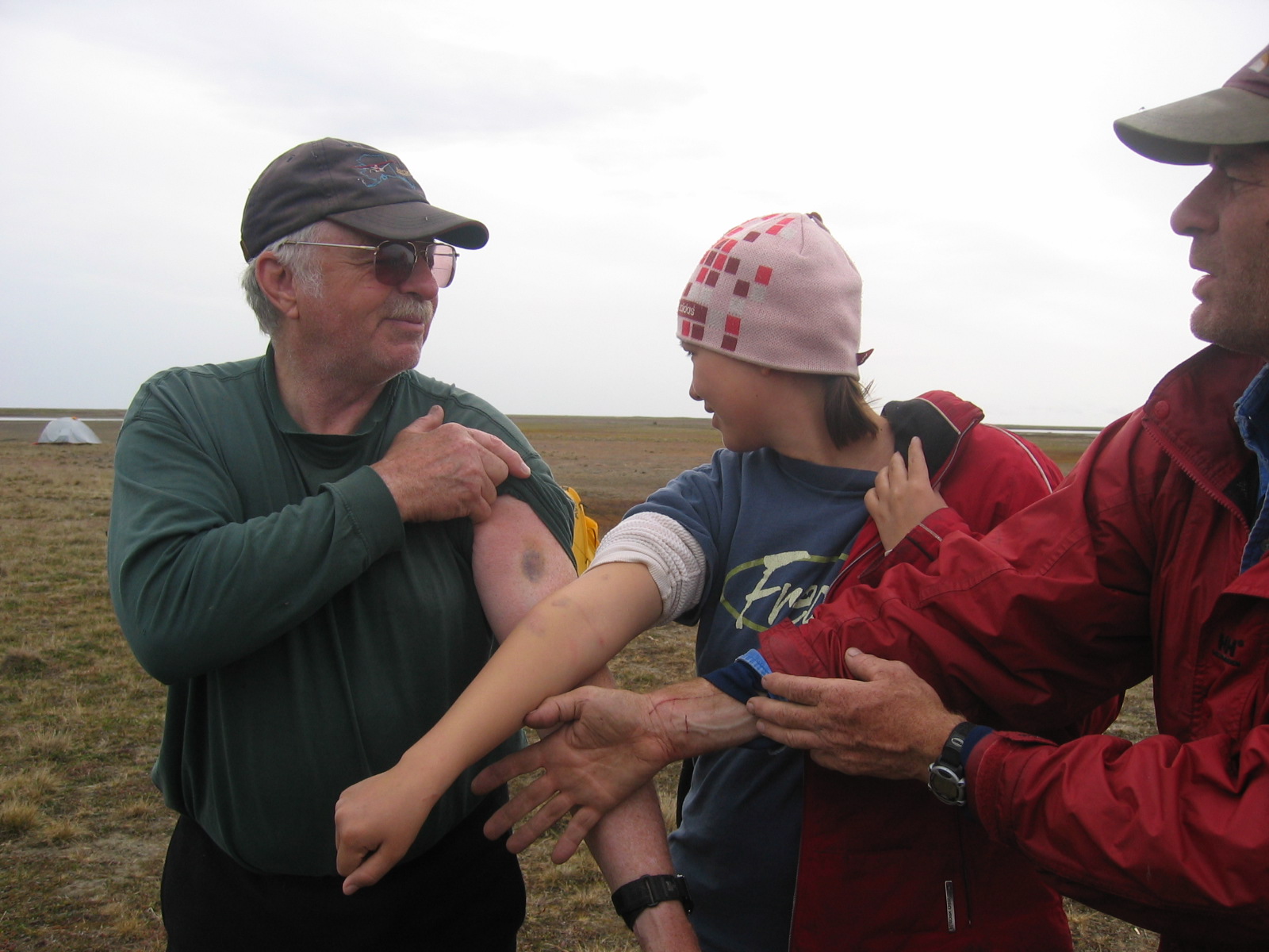 Pilot Sandy Hamilton, Rita Acker, and Bob Ritchie from ABR, Inc., compare goose bites and bruises after banding, near Barrow, Alaska.
