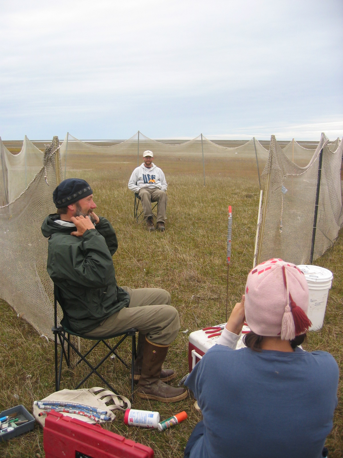 John Rose, John Shook, both of ABR, Inc. and Rita Acker wait for snow geese (*Chen caerulescens*) to band, near Barrow, Alaska.