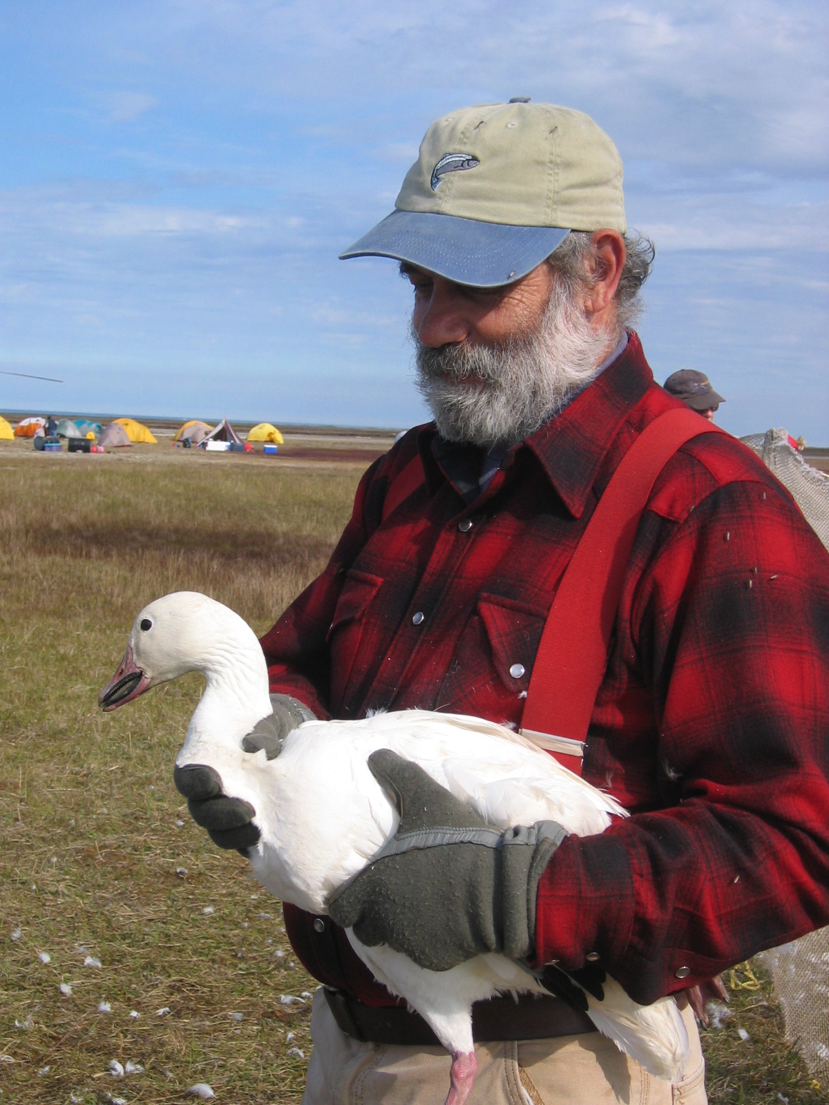 Helicopter Pilot Larry Larrivee holds a snow goose on the Ikpikpuk Delta, near Barrow, Alaska.