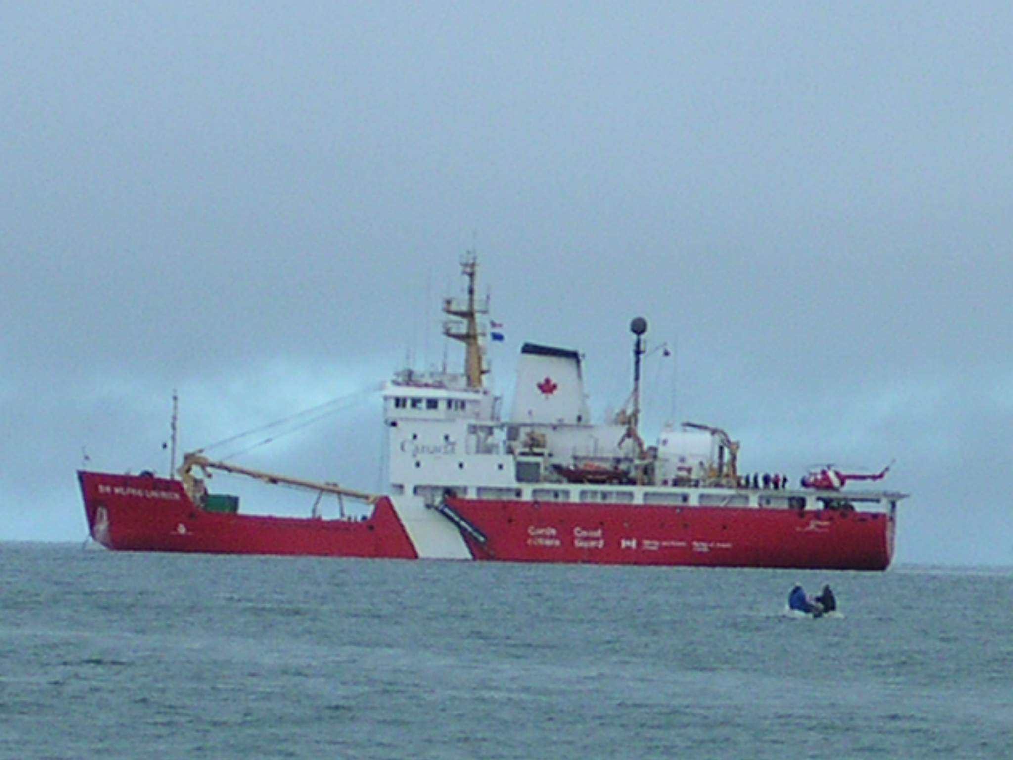 The Canadian Coast Guard Icebreaker Sir Wilfrid Laurier with its helicopter out on deck. Seen near Barrow, Alaska.
