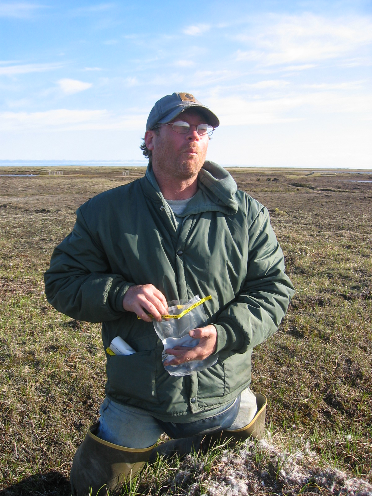Biologist Brian Person picks pin feathers that will be used in a genetic study of the snow geese (*Chen caerulescens*) of the Ikpikpuk Delta.