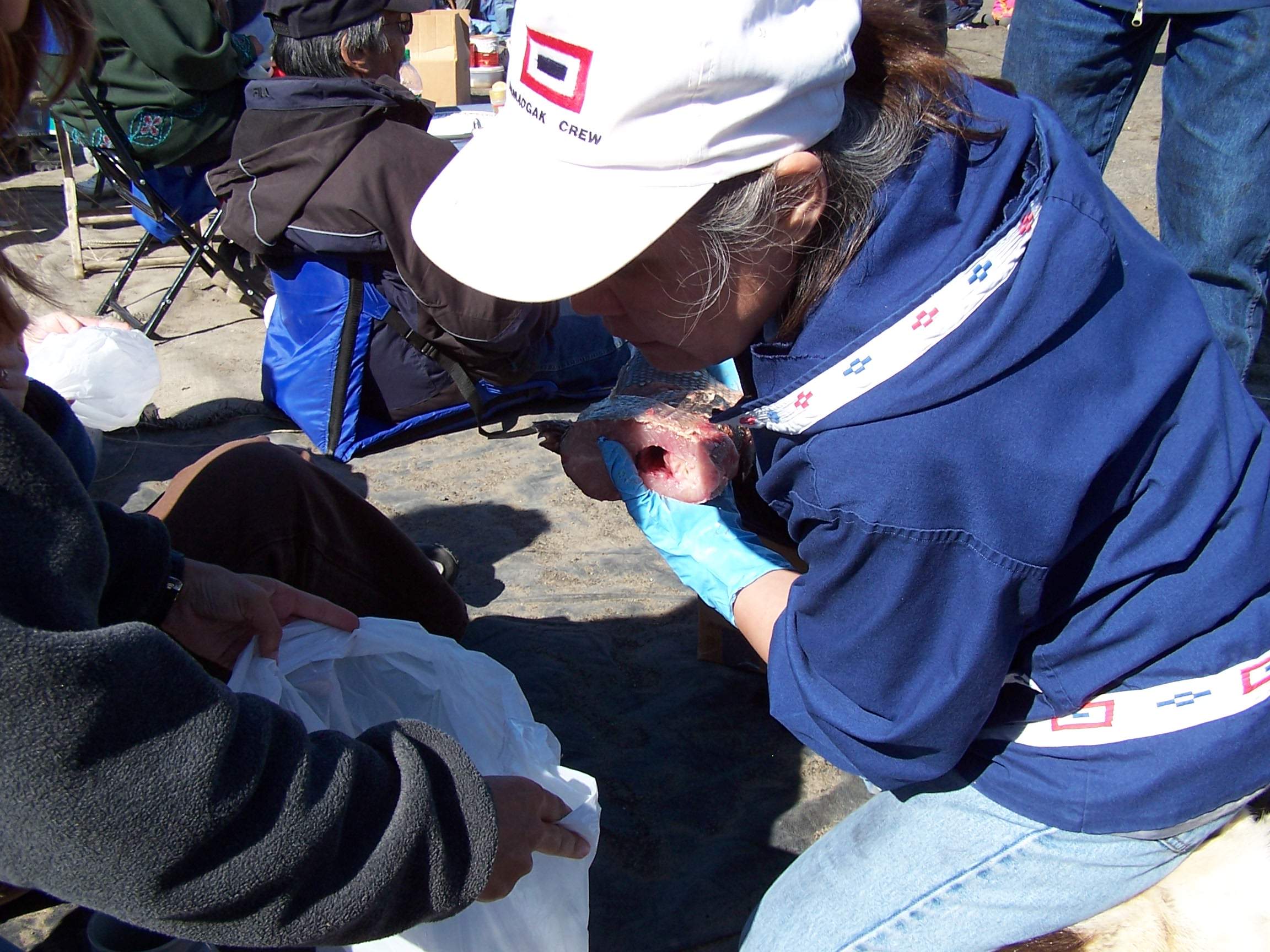 Serving white fish at the Nalukataq, the annual outdoor festival, where each whaling crew that caught a whale the past spring serves a “banquet” of Native food to everyone who comes. Barrow, Alaska.
