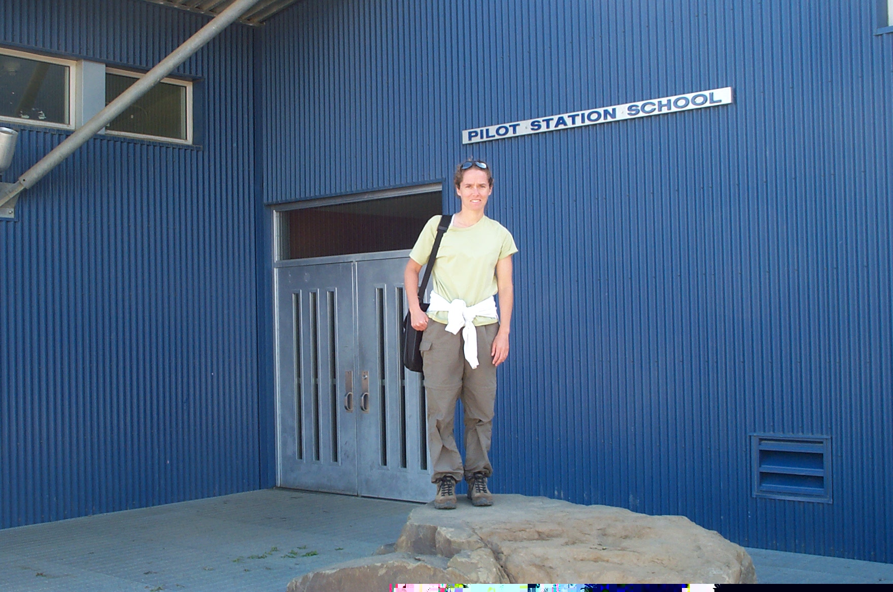 TREC teacher Amy Clapp stands in front of the Pilot Station, AK school.