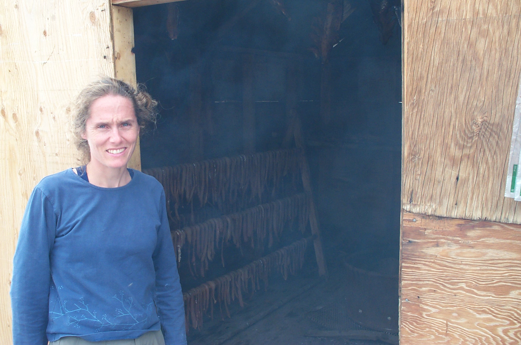 TREC teacher Amy Clapp outside of a fish house in Tsiigehtchic, Canada.