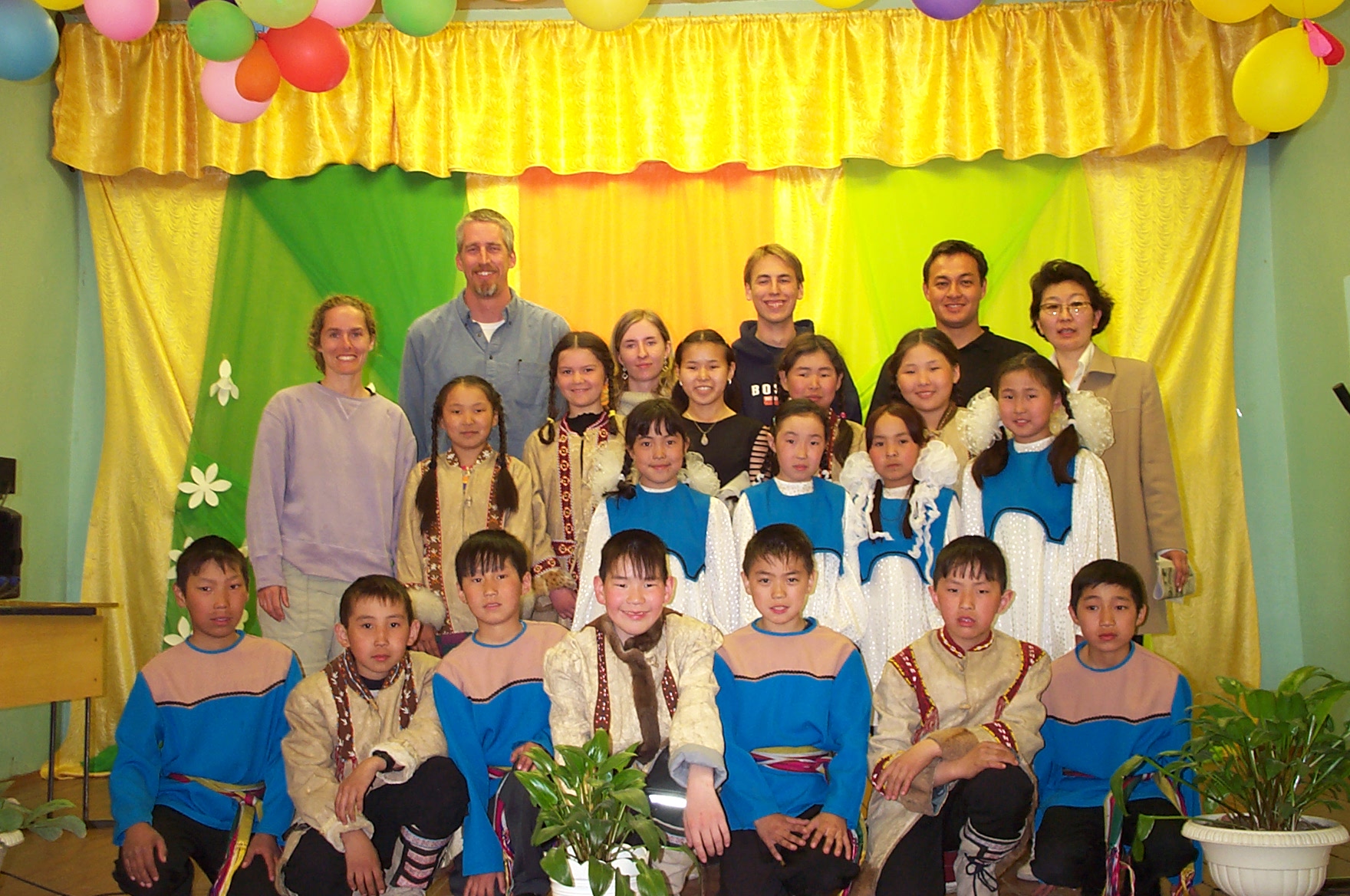 TREC teacher Amy Clapp, TREC researcher Max Holmes, student Oliver Monson, Chris Guay, and local Zhigansk school children.