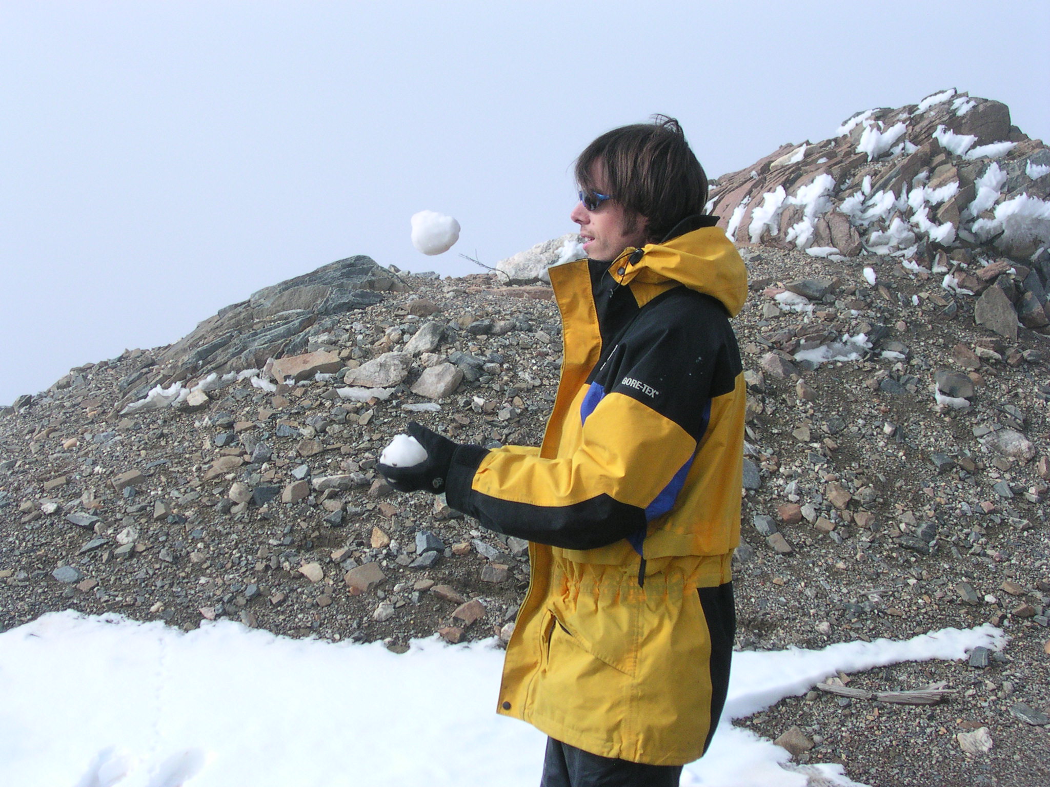 Graduate student Ken Tape juggles some snow during TREC teacher John Sode's 2005 expedition to Thule, Greenland.