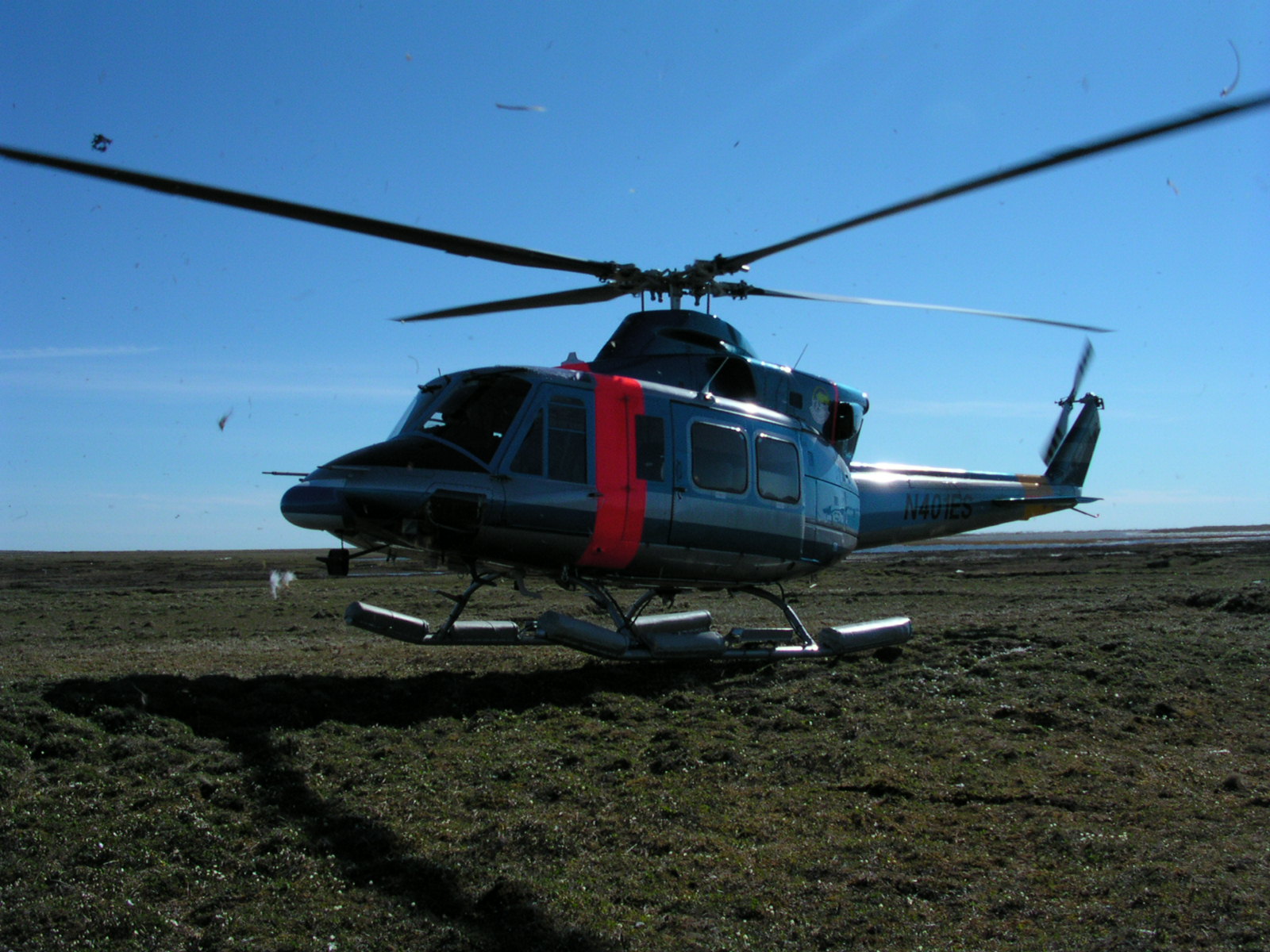 A helicopter flying over the Ikpikpuk Delta coming to pick up TREC teacher Leslie Pierce and biologist Brian Person.