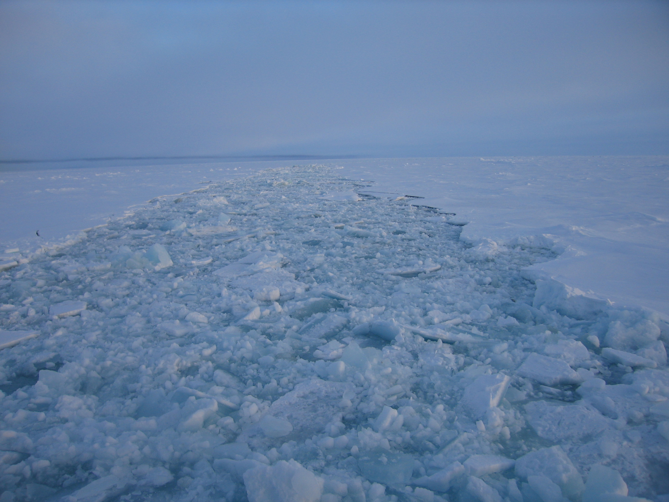 The trail of broken ice left behind the USCGC Healy. It is quickly refreezing.
