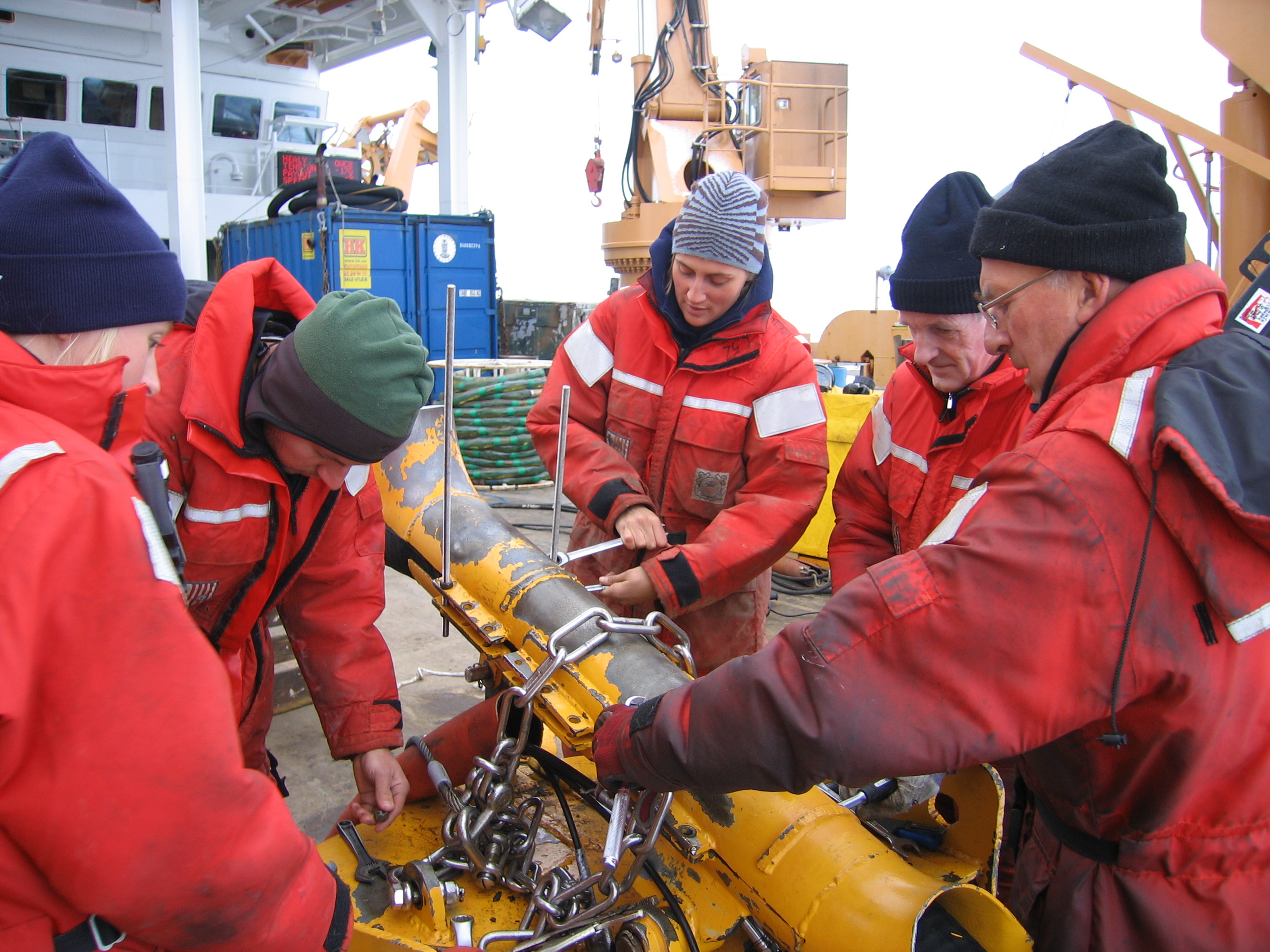 The seismic team adjusts the seismic air gun equipment on board the USCGC Healy.