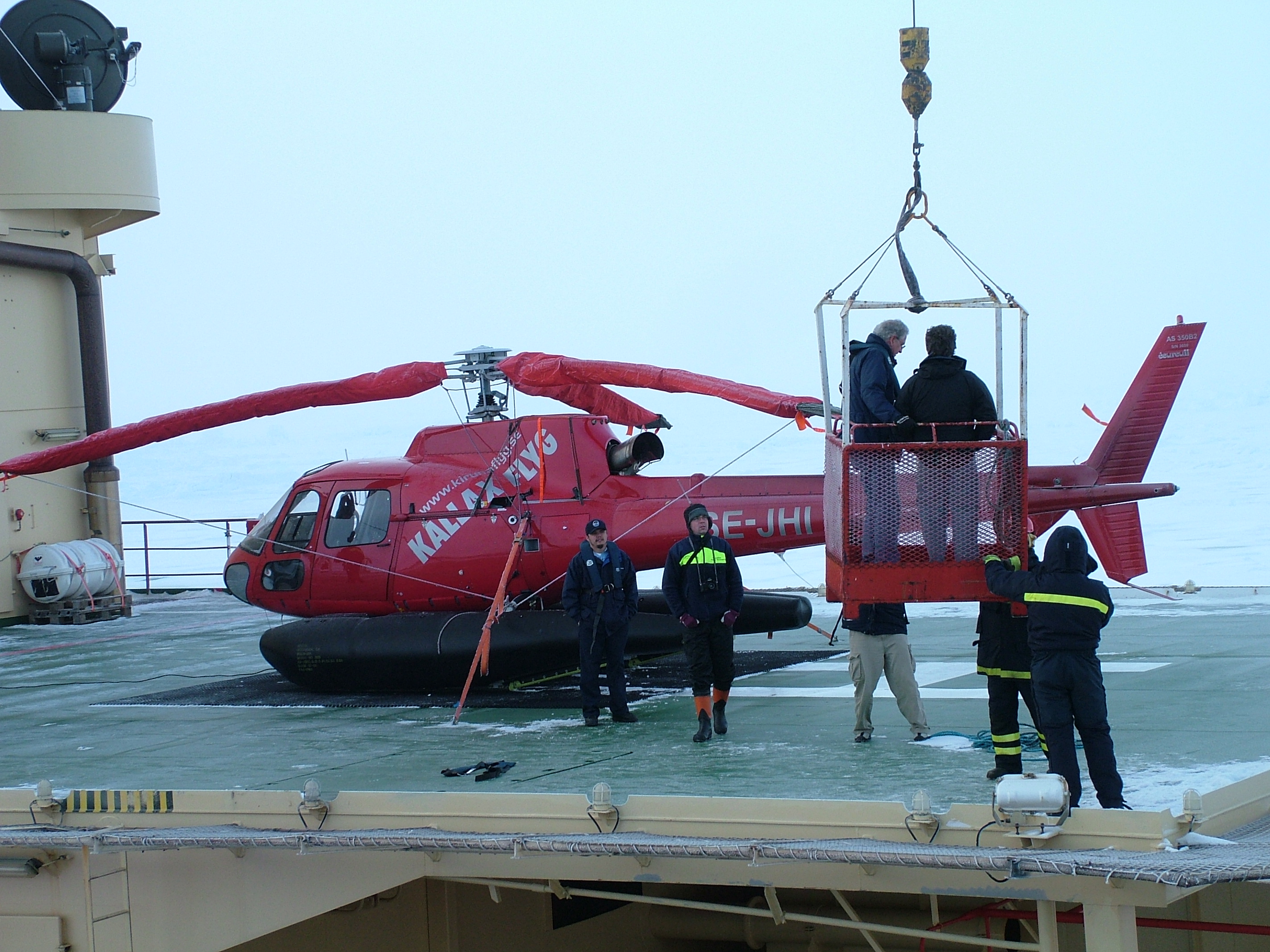 The transfer of crew members from the Swedish icebreaker Oden to the USCGC Healy by crane.