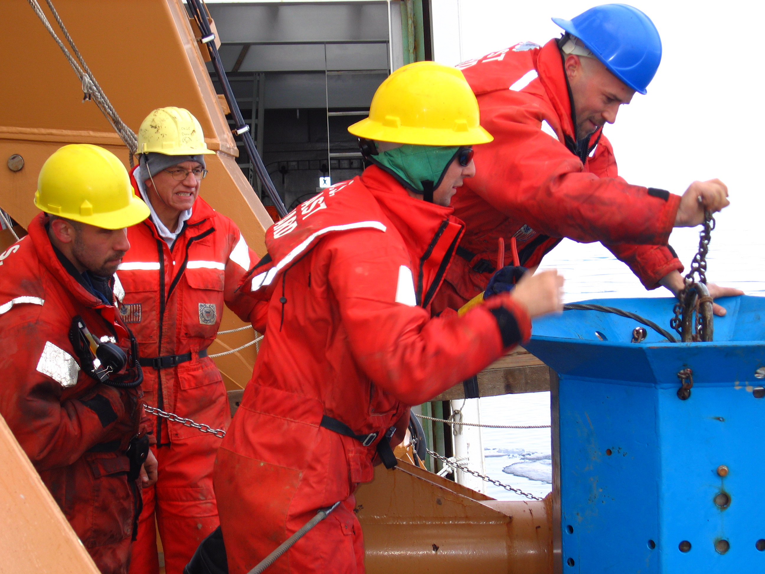 Dale Hubbard, Dennis Darby, and some marine science technicians getting the Jumbo Piston Core (JPC) ready to take a sediment core of the Arctic Ocean floor.