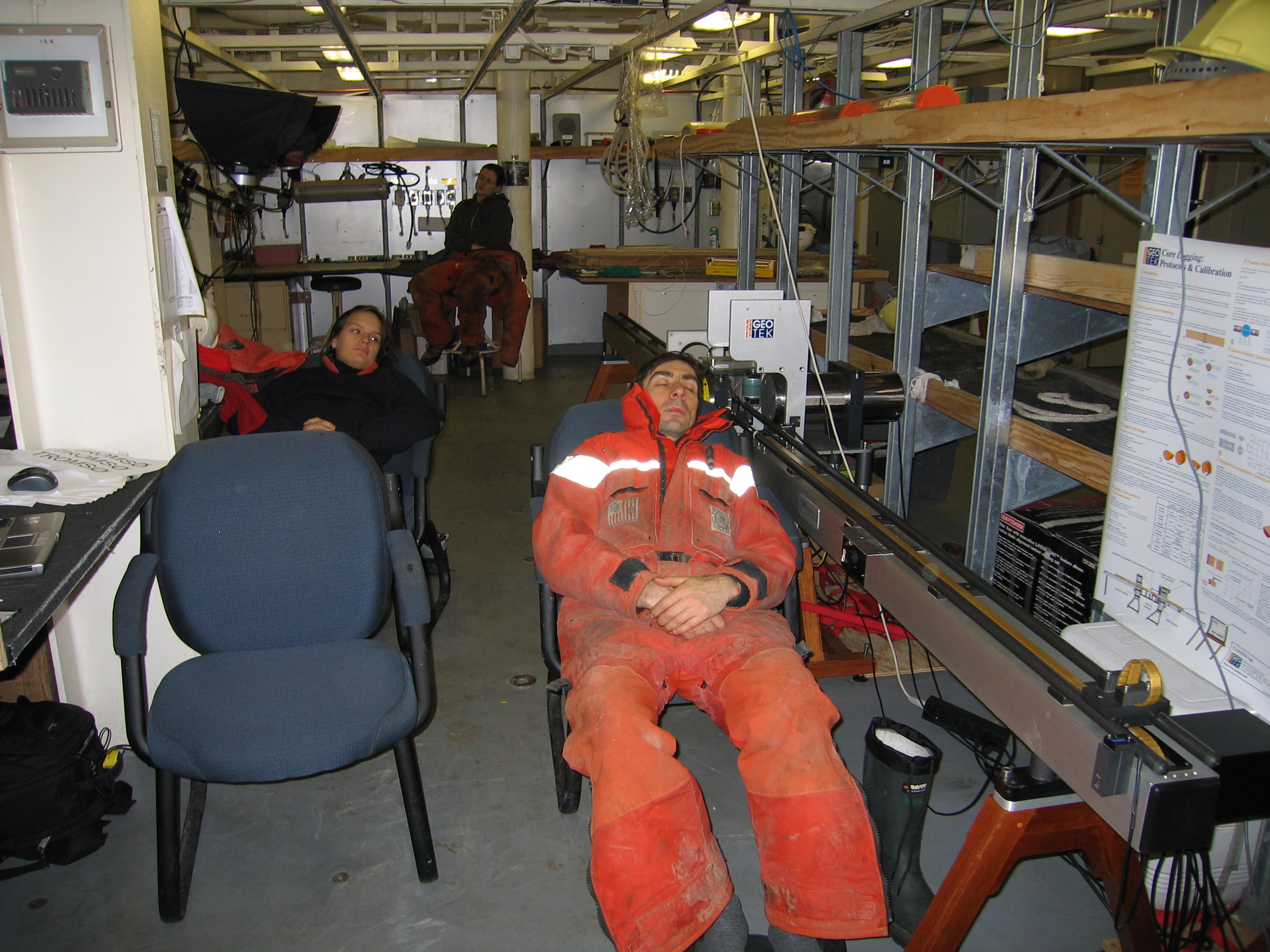 Research team members resting between collecting sediment cores on the USCGC Healy.