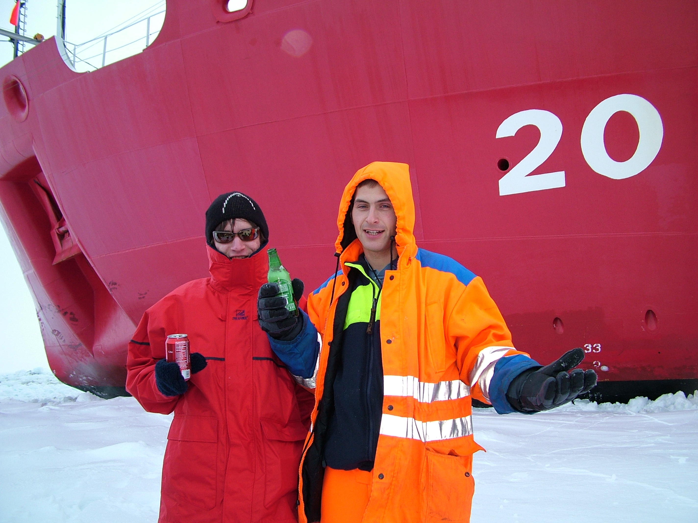 The crew of the USCGC Healy enjoy an ice liberty at the North Pole.