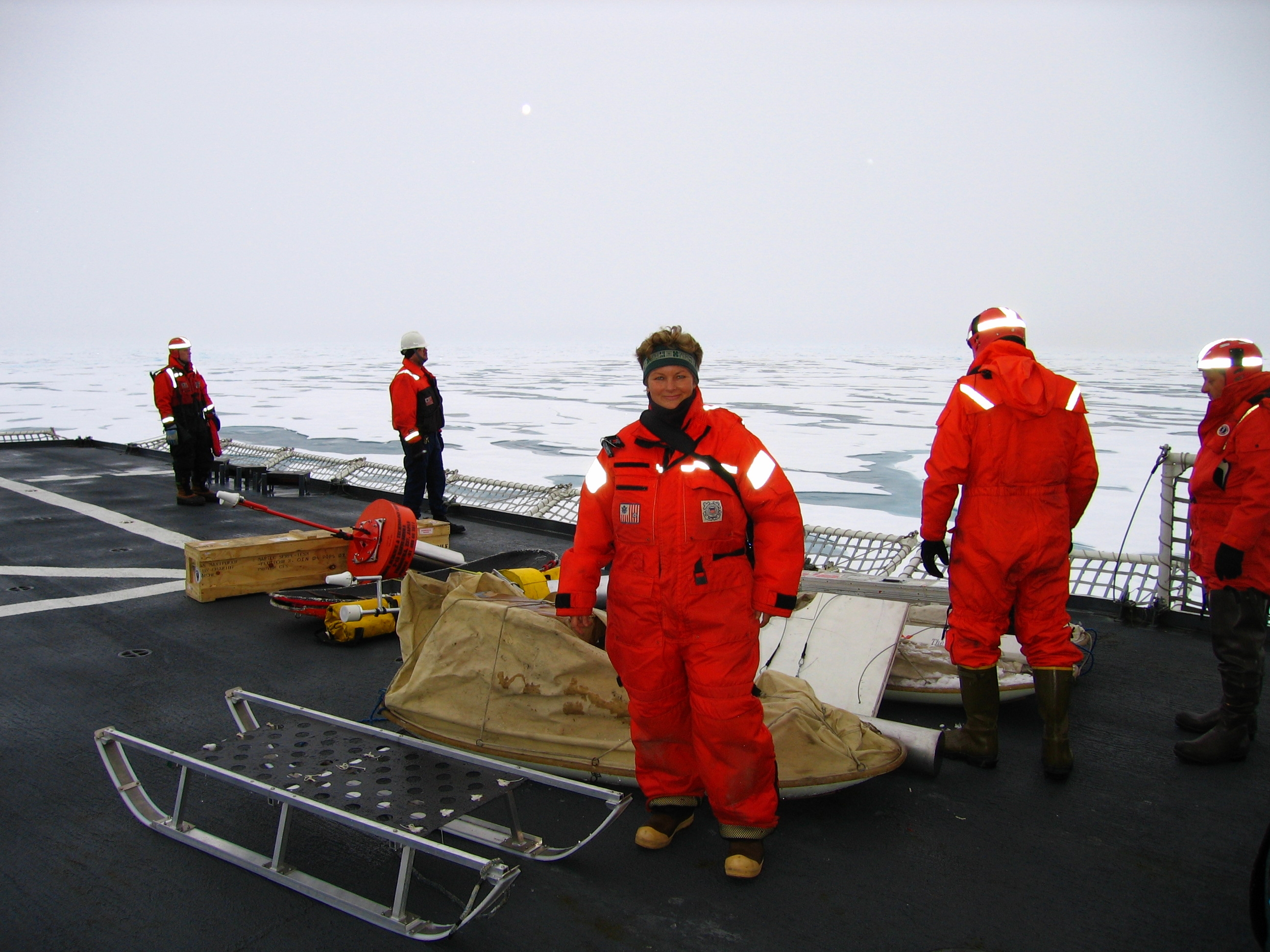 TREC teacher Ute Kaden in a mustang survivla suit on the deck of the USCGC Healy.