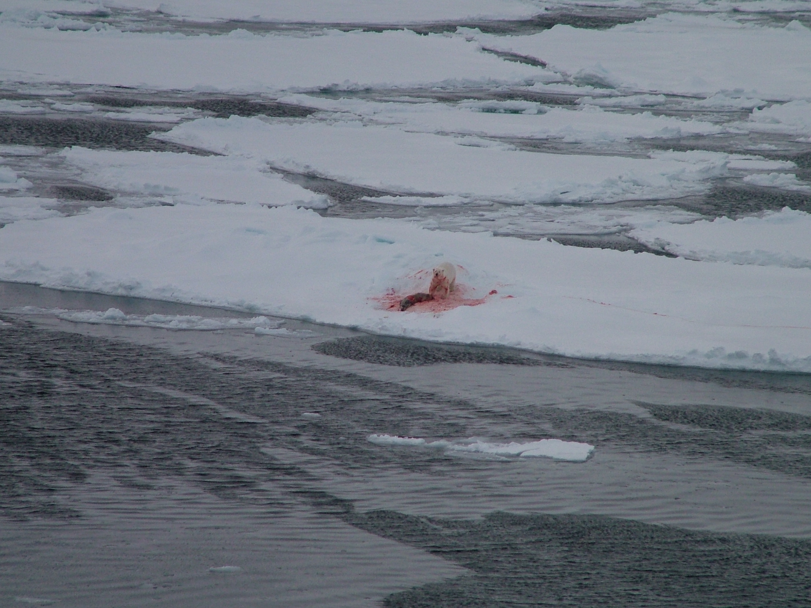 A polar bear feeding on a seal as seen by the USCGC Healy.