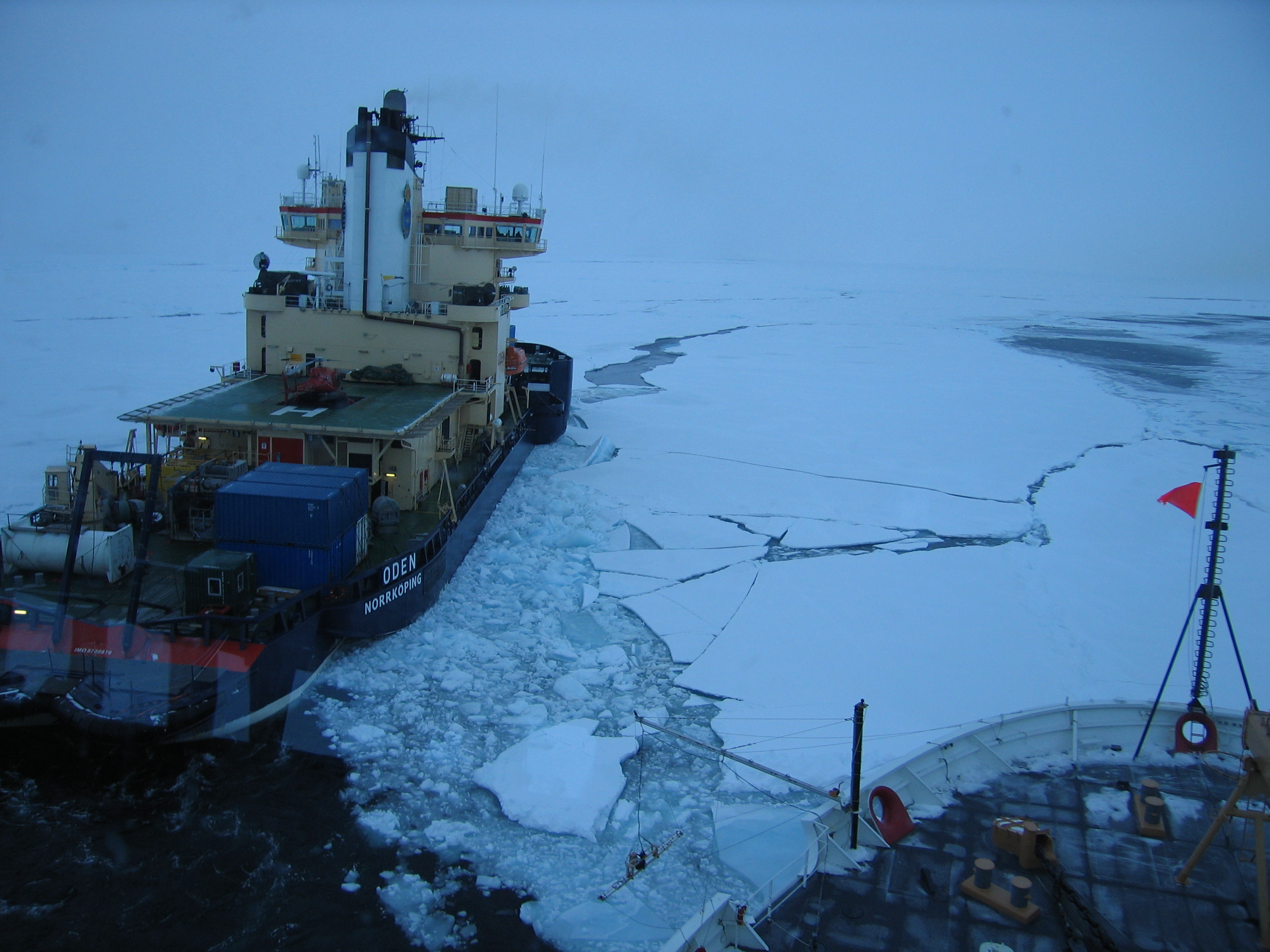 The path through the ice made by the USCGC Healy with the Swedish icebreaker Oden in the background.