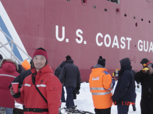The crew of the USCGC Healy enjoy an ice liberty at the North Pole.