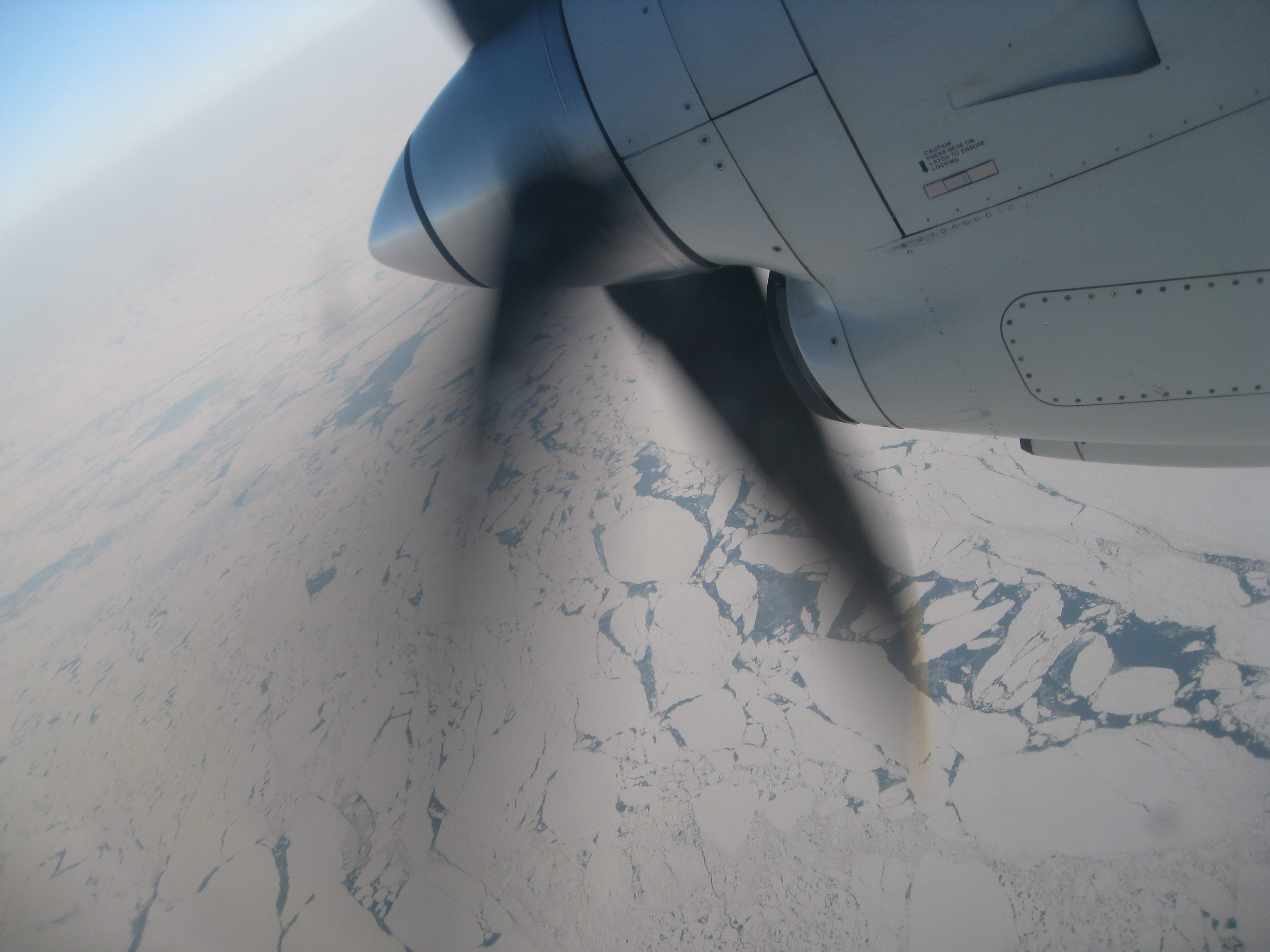 Flying over sea ice on the flight to UnAlaska, Alaska.