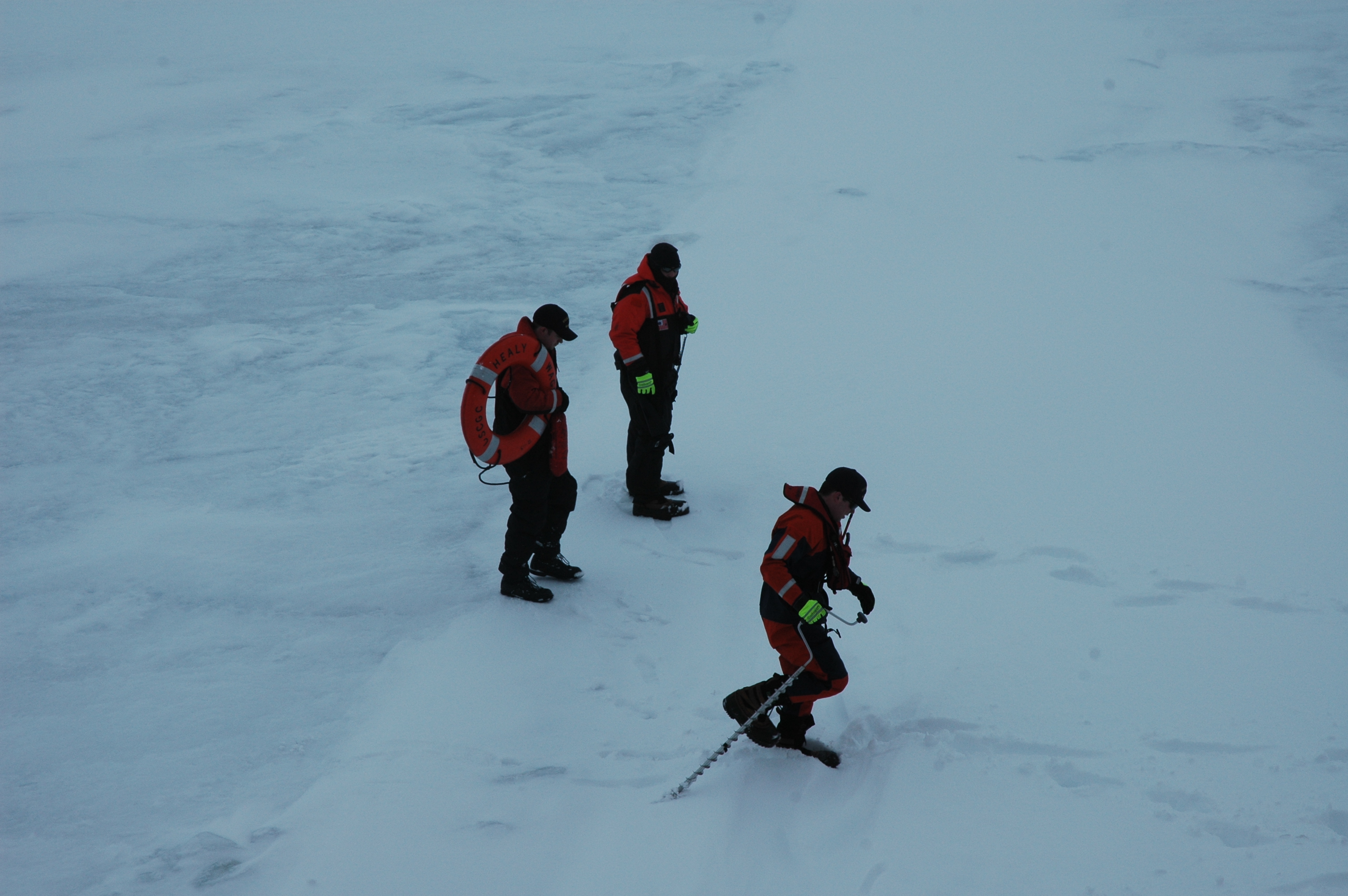 These guys are on ice and bear patrol. The guy in the front has the auger and the guy in the back has a gun. The middle guy is a rescue swimmer. On the sea ice near the USCGC Healy icebreaker, on the Bering Sea.