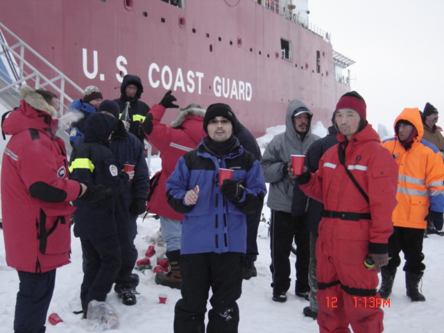 The crew of the USCGC Healy enjoy an ice liberty at the North Pole.