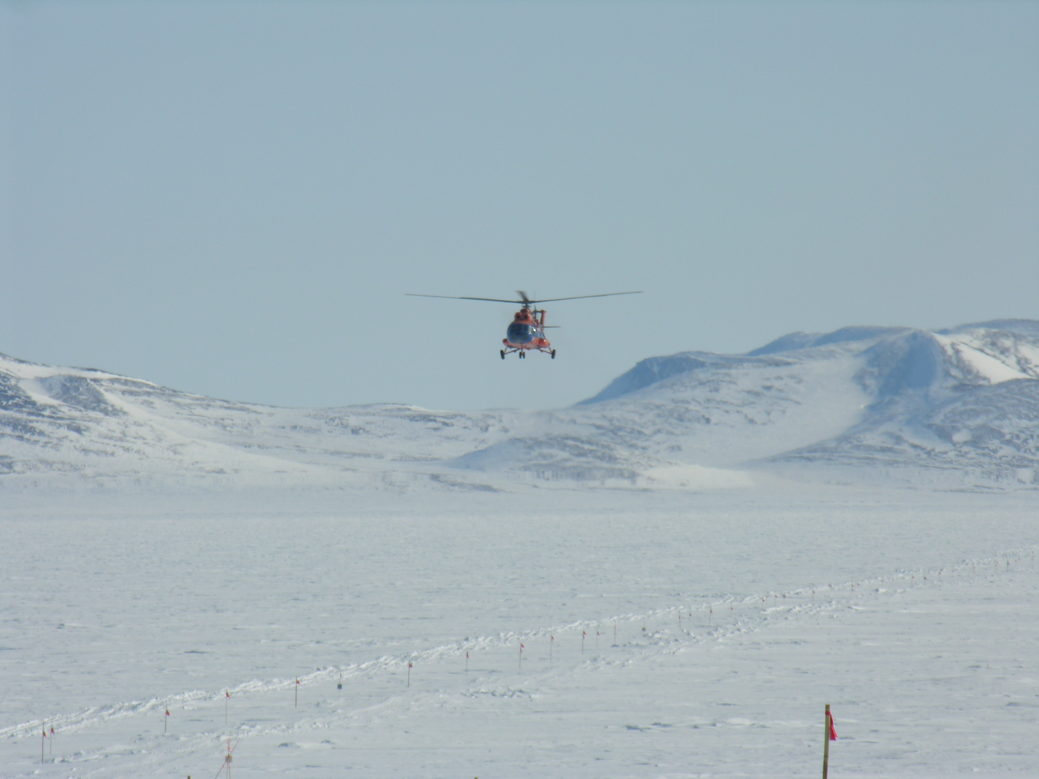 Arrival of the new DOSECC drillers on board the helicopter. Camp El'gygytgyn, Chukotka, Russia.