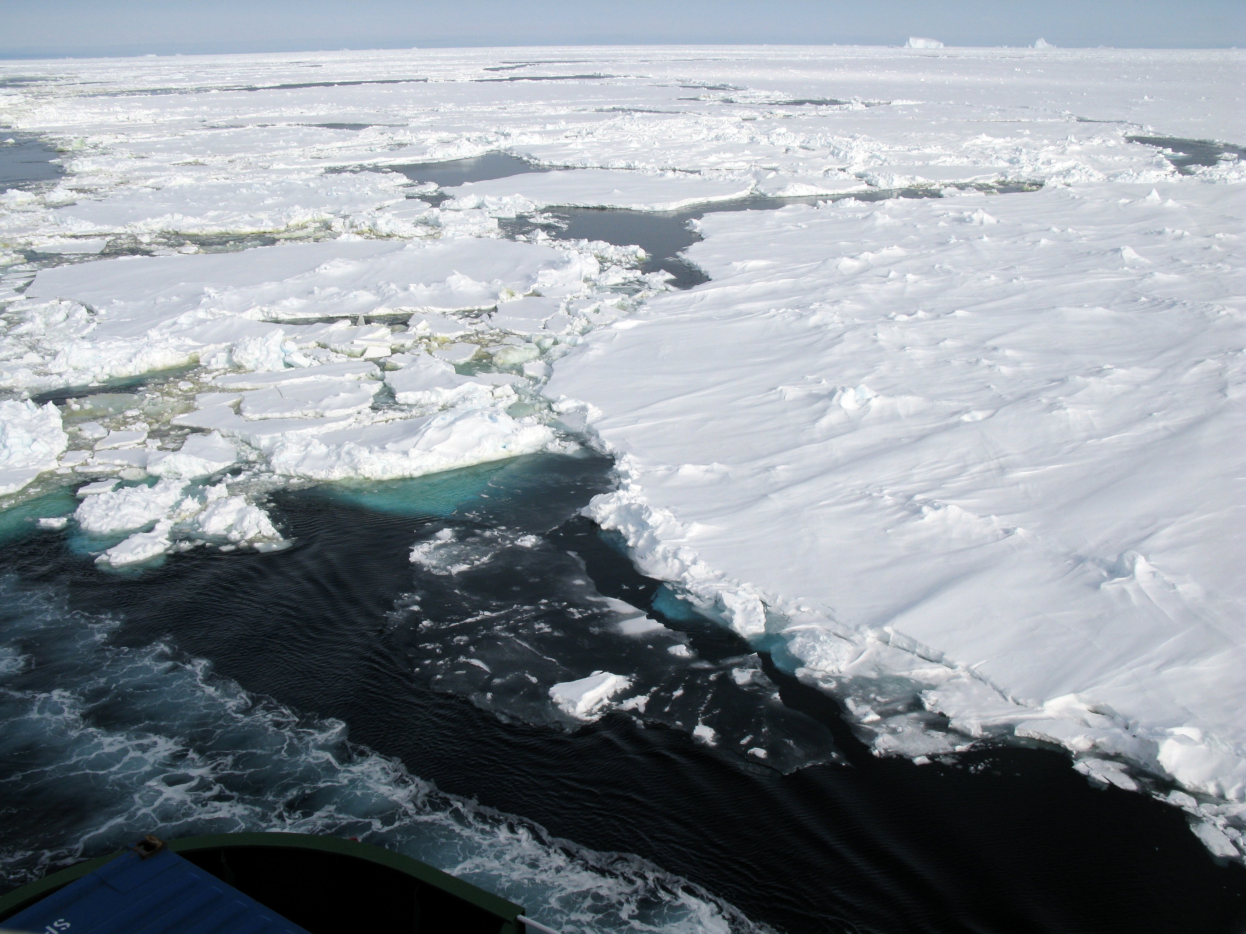 Thin grey ice floats next to large ice floes. Aboard the icebreaker Oden between the Amundsen Sea and the Ross Sea.
