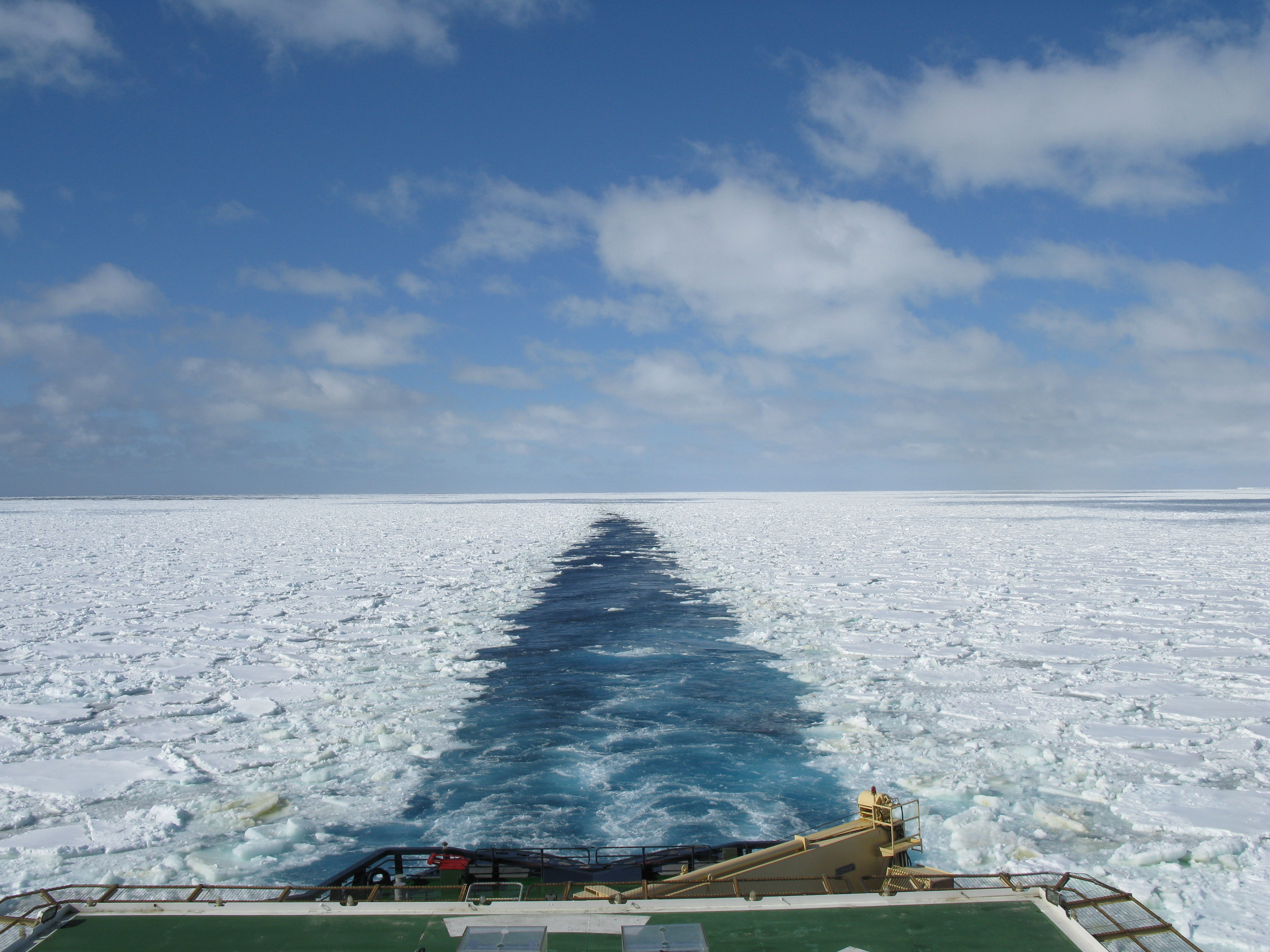 The path that the Oden cuts through the sea ice is called Oden Street. Aboard the icebreaker Oden in the Bellingshausen Sea.