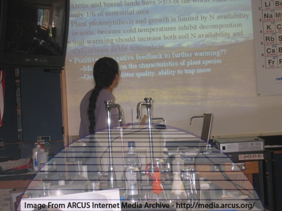 Arctic Visiting Speaker Dr. Syndonia Bret-Harte lectures to teacher Tom Crumrine's class during her May 2006 visit to Concord High School in New Hampshire.