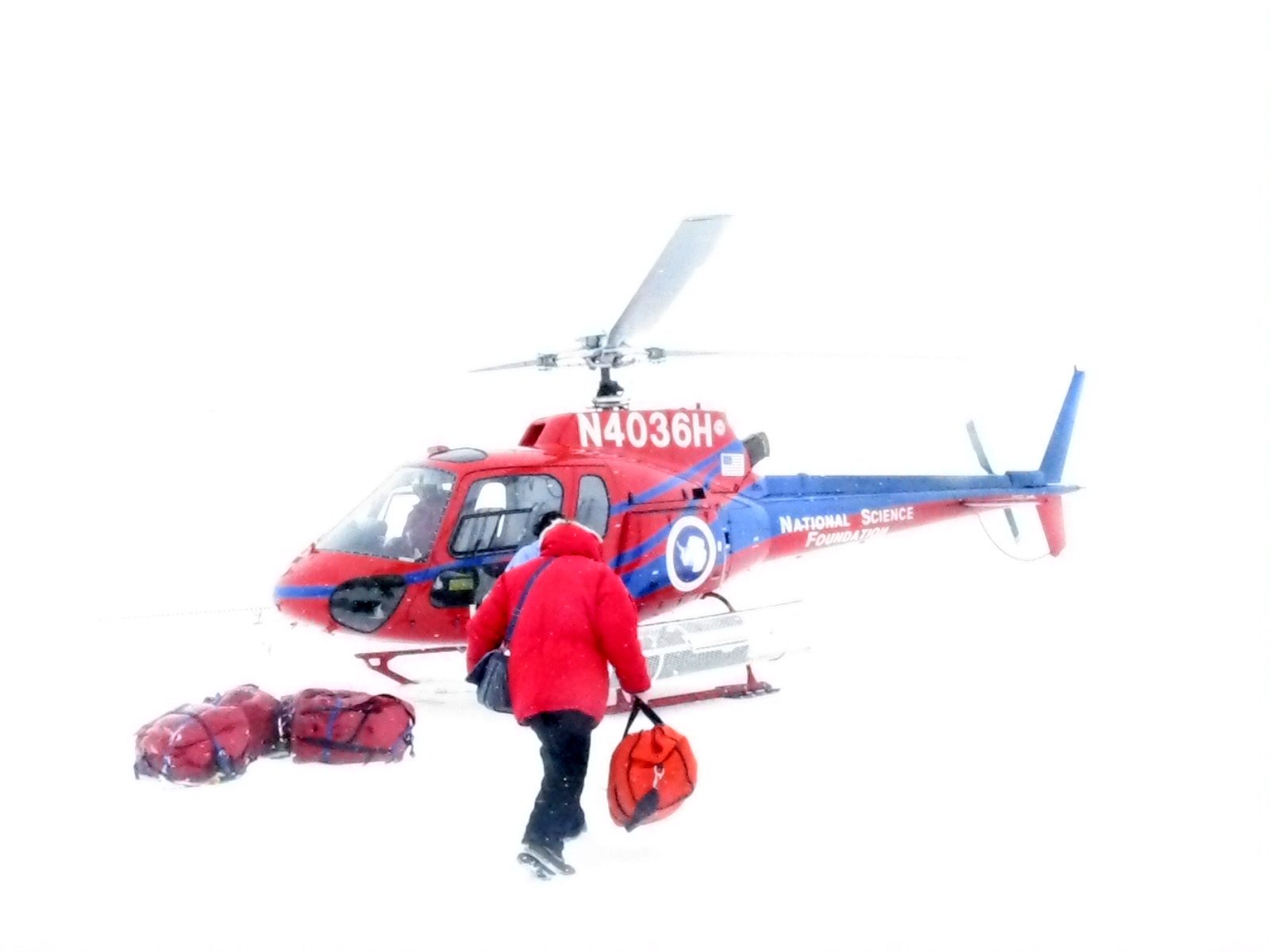Jakob Wegelius makes a run towards the helicopter as it kicks up the snow. On the sea ice in McMurdo Sound.