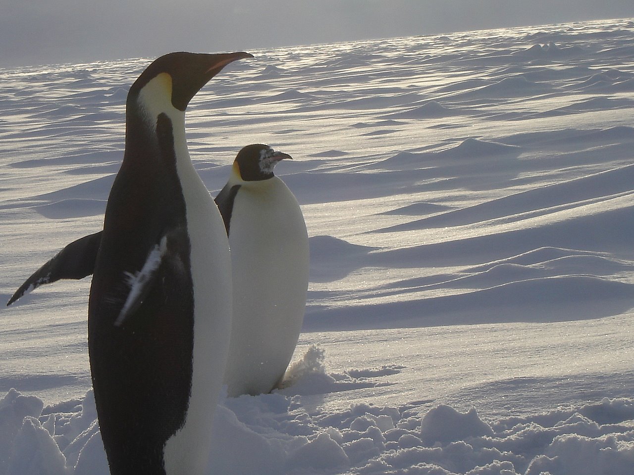 Two curious Emperor Penguins stand watch as the ice team works at dawn. On the sea ice in the Amundsen Sea.